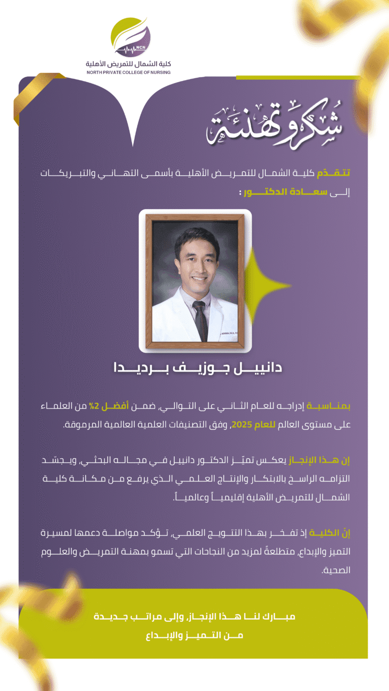 Northern Educational Company الشركة المالكة لكلية الشمال للتمريض الأهلية وهيكلية تدرس مرحلة البكالوريوس فـي علوم التمريض Be a Partner of the Success شركة الشمال التعليمية للتعليم الشركة المالكة لكلية الشمال للتمريض الأهلية وهيكلية تدرس مرحلة البكالوريوس فـي علوم التمريض Be a Partner of the Success About Us شــركــة الشمال التعليمية للتعليم هــي شركة متخصصة بمجال التعليم الــجــامعي تأسست شركة الشمال التعليمية للتعليم فــي المملكة العربية الـسـعـوديــة بمنطقة الحدود الشمالية مدينة عرعر كلية الشمال للتمريض الأهلية بكالوريوس التمريض قبول طلاب التجسير نظام التسريع Home كلية الشمال للتمريض الأهلية بكالوريوس التمريض قبول طلاب التجسير نظام التسريع Home News All News Related to the Company and the College Newsكلمة عميد كلية الشمال بمناسبة اليوم الوطنيكلمة عميد كلية الشمال بمناسبة اليوم الوطنيإقرأ المزيدتحت شعار “لا تَنساني”تحت شعار لا تنساني نظّمت وحدة خدمة المجتمع ووحدة الإرشاد الأكاديمي في كلية الشمال للتمريض الأهلية، وبالتعاون مع الجمعية السعودية…إقرأ المزيدفنيات كتابة التقارير والخطابات والمراسلاتفنيات كتابة التقارير والخطابات والمراسلات في إطار حرص شركة الشمال التعليمية للتعليم على تطوير الكفاءات الإدارية وتعزيز مهارات أعضاء هيئة…إقرأ المزيدلقاء تعريفي لتهيئة طلاب الامتياز لفترة التدريب الميدانيلقاء تعريفي لتهيئة طلاب الامتياز لفترة التدريب الميداني نظّمت كلية الشمال للتمريض الأهلية يوم الاثنين 3 فبراير 2025 لقاءً تعريفياً…إقرأ المزيداستراتيجيات حل الأسئلة في الاختبارات المهنية: محاضرة تدريبية لطلاب التمريضبالتعاون مع شركة حلول التمريض: استراتيجيات حل الأسئلة في الاختبارات المهنية “محاضرة تدريبية لطلاب التمريض” نظمت كلية الشمال للتمريض الأهلية…إقرأ المزيداحتفالية يوم الجودة العالمي لتعزيز التميز المؤسسياحتفالية يوم الجودة العالمي لتعزيز التميز المؤسسي ضمن جهودها لتعزيز معايير الجودة والاعتماد المؤسسي، نظمت كلية الشمال للتمريض الأهلية…إقرأ المزيدعرص المزيدEnd of Content. للعام الثاني على التوالي : Videos The latest videos related to the Company and the College Medals and honors